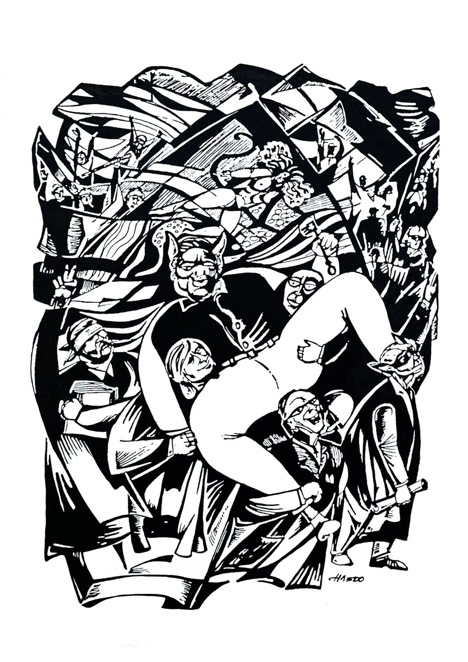 “Beneath the sharp lines of this composition, a society unfolds where manipulation and oppression blend into organized chaos. The powerful laugh, the crowds stir, but behind the mask of the political carnival, reality remains unchanged.”